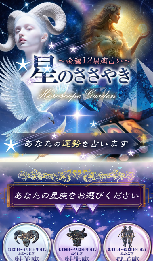 「期間限定 日本で一番当たる占い」と言った感じの広告があって、ちょっと見てみようかなと思ってクリックしました。鑑定歴30年の女性が貴方に合う金運占いサイトを教えると書いてあったので、そこから星座と生年月日など入れてLINE登録。星座占いとは別の占い師から声をかけられました。