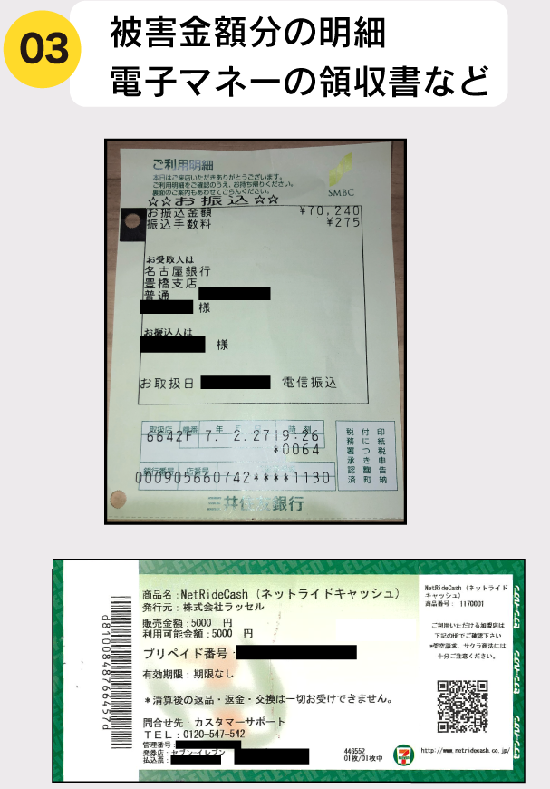 - 被害金額の証明になる明細や領収書
