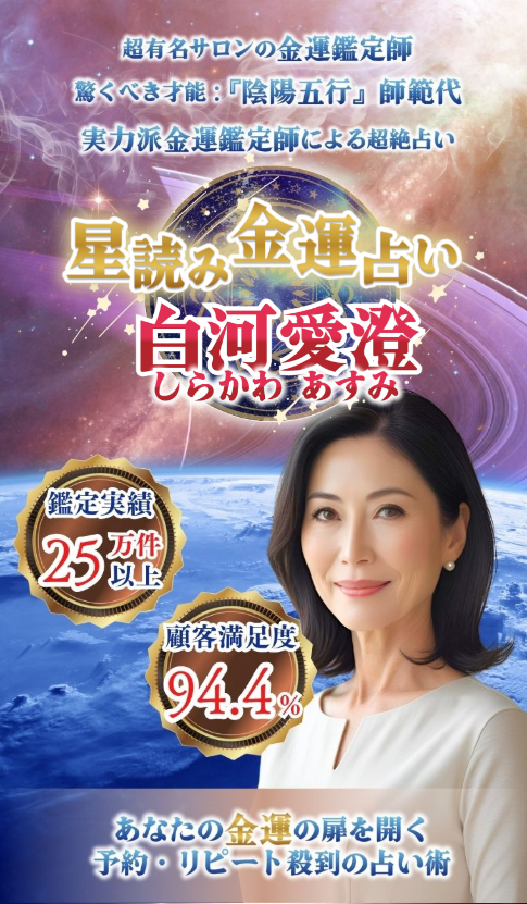 白河愛澄誘導用鑑定師誘導サイトでしか確認できない鑑定師。超有名占いサロン出身で「陰陽五行」師範代という設定。陰陽五行自体に「師範代」という制度は確認出来ないため、肩書きが集客用の可能性あり。