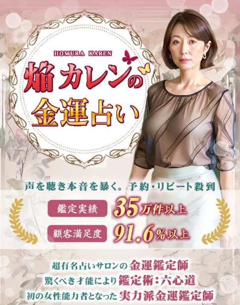 桜凜プレミア鑑定師輝煌寿福天星術なる鑑定法を使う設定。「黄金星解放期という大チャンスの到来がある」と急に話しかけ、「星々に願いを届けるだけ」の簡単な鑑定だと勧誘する。また、他言無用を強制してくると報告あり。